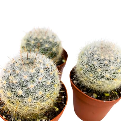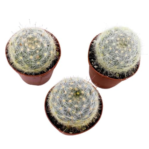 BubbleBlooms Powder Puff Cactus 2 inch Set of 3 Mammillaria bocasana White Yellow Crown of Flowers Tiny Mini Pixie Plants